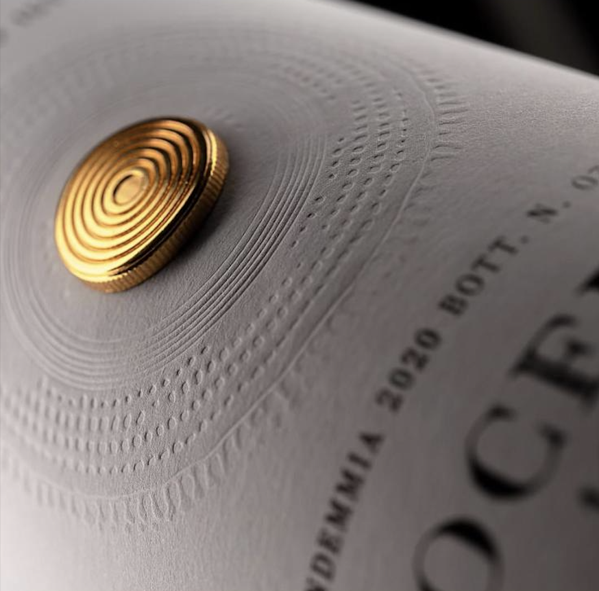 Grazie alla Ricerca e Sviluppo, abbiamo realizzato un’etichetta con applicazione di un elemento in oro, un layering che dona particolarità, eleganza, preziosità al prodotto finale.
